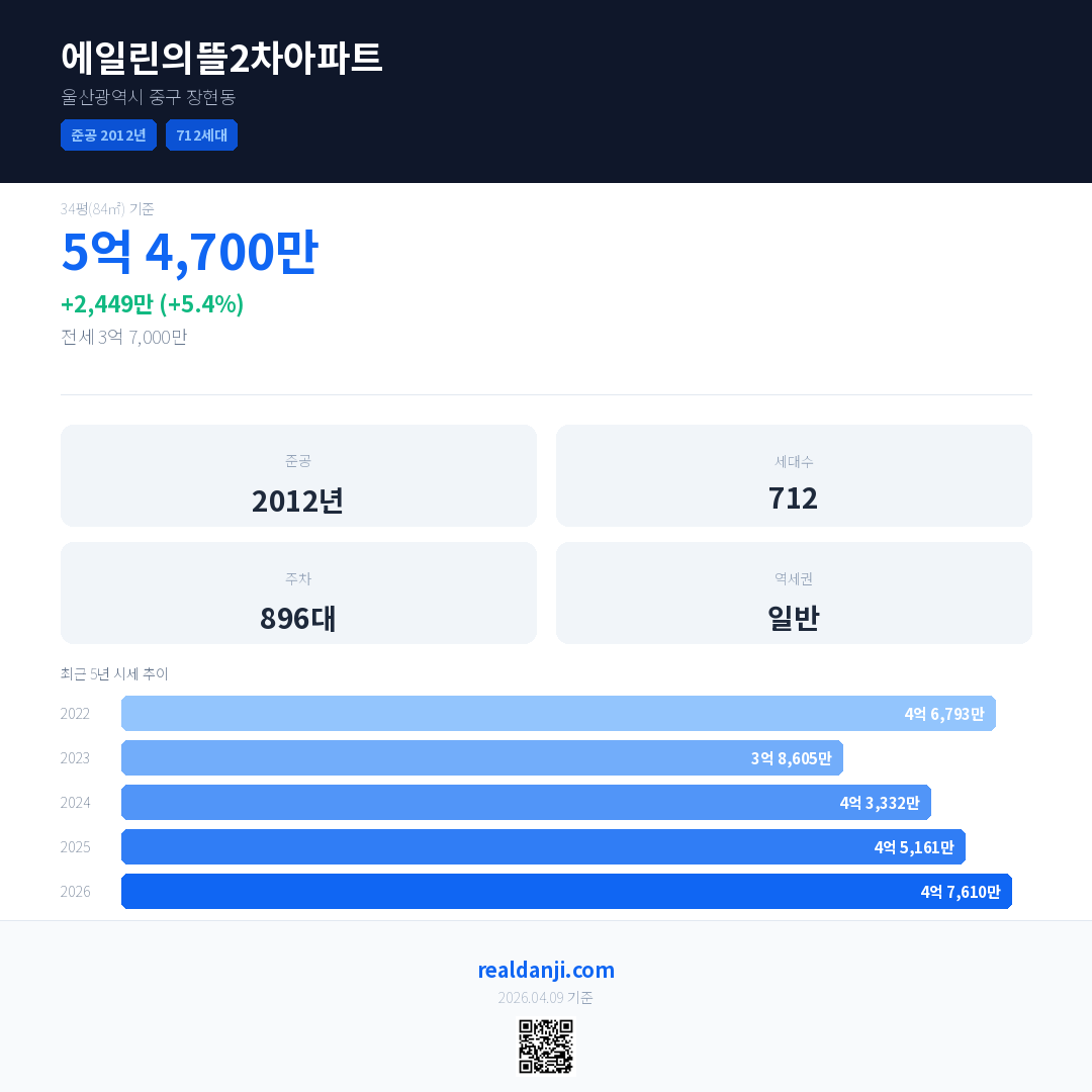 에일린의뜰2차아파트 국민평형 기준 2026년 평균 거래가는 4억 7,610만으로, 전년 대비 5.4% 상승 했습니다.