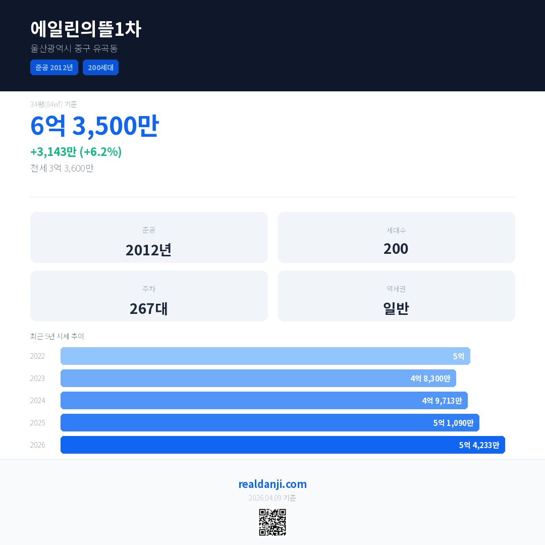에일린의뜰1차 국민평형 기준 2026년 평균 거래가는 5억 4,233만으로, 전년 대비 6.2% 상승 했습니다.