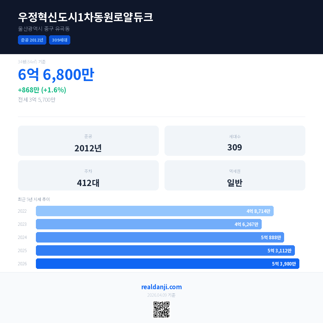 우정혁신도시1차동원로얄듀크 국민평형 기준 2026년 평균 거래가는 5억 3,980만으로, 전년 대비 1.6% 상승 했습니다.