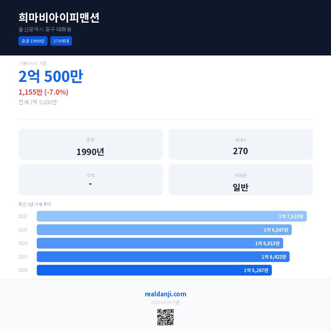 희마비아이피맨션 국민평형 기준 2026년 평균 거래가는 1억 5,267만으로, 전년 대비 7.0% 하락 했습니다.