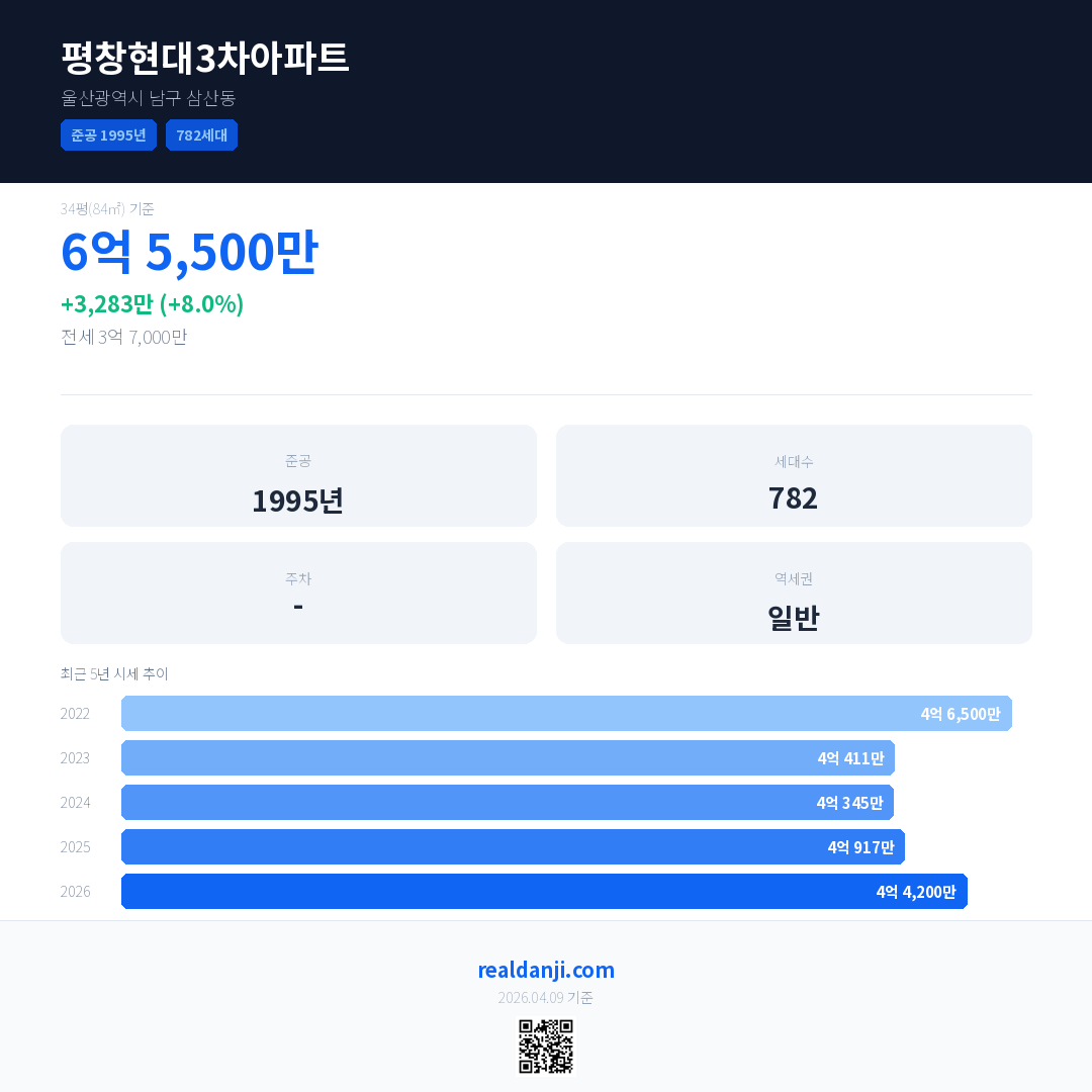 평창현대3차아파트은(는) 1995년에 준공되었으며, 현재 31년차입니다. 총 782세대 규모입니다.