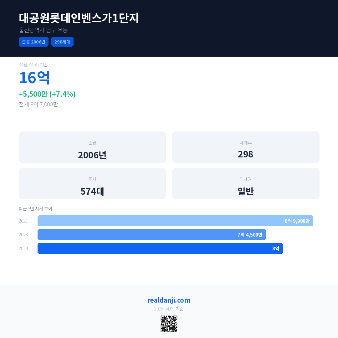대공원롯데인벤스가1단지 최근 거래가는 16억입니다. (2026-04)