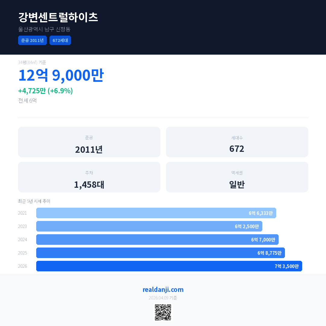 강변센트럴하이츠 국민평형 기준 2026년 평균 거래가는 7억 3,500만으로, 전년 대비 6.9% 상승 했습니다.