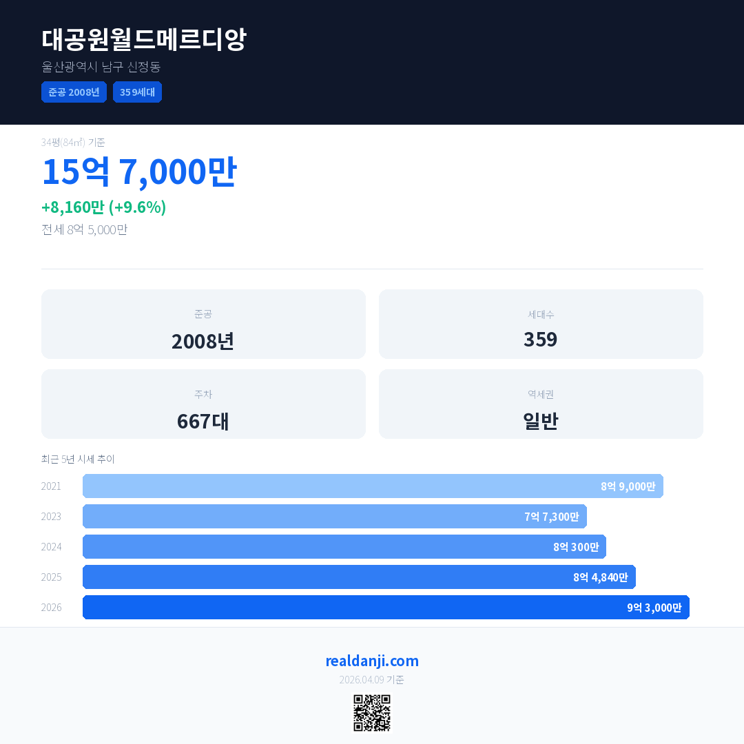대공원월드메르디앙 국민평형 기준 2026년 평균 거래가는 9억 3,000만으로, 전년 대비 9.6% 상승 했습니다.