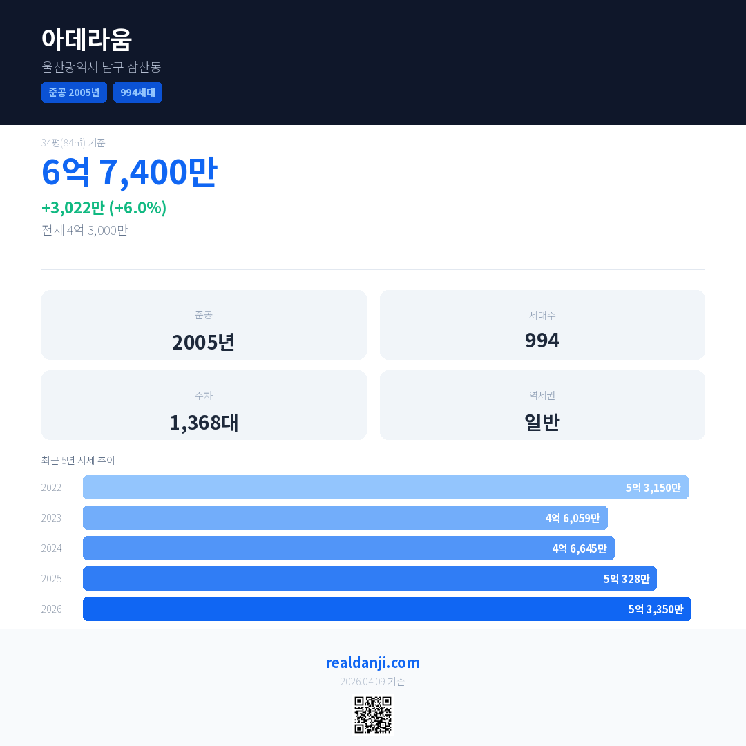 아데라움 국민평형 기준 2026년 평균 거래가는 5억 3,350만으로, 전년 대비 6.0% 상승 했습니다.