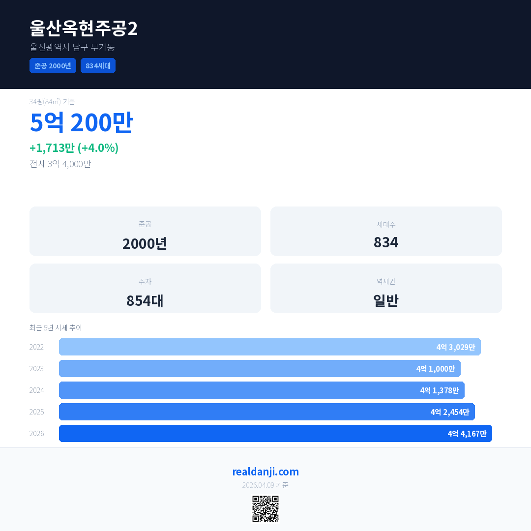 울산옥현주공2 국민평형 기준 2026년 평균 거래가는 4억 4,167만으로, 전년 대비 4.0% 상승 했습니다.