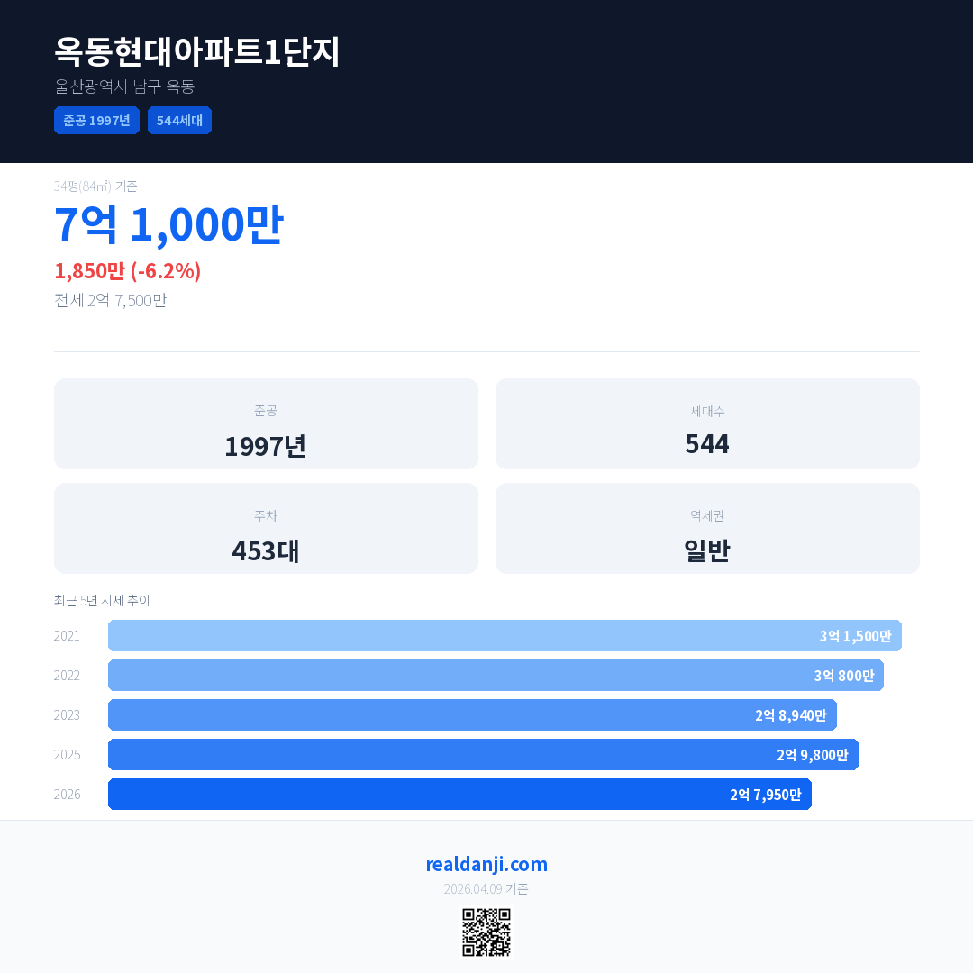 옥동현대아파트1단지 최근 거래가는 7억 1,000만입니다. (2026-03)