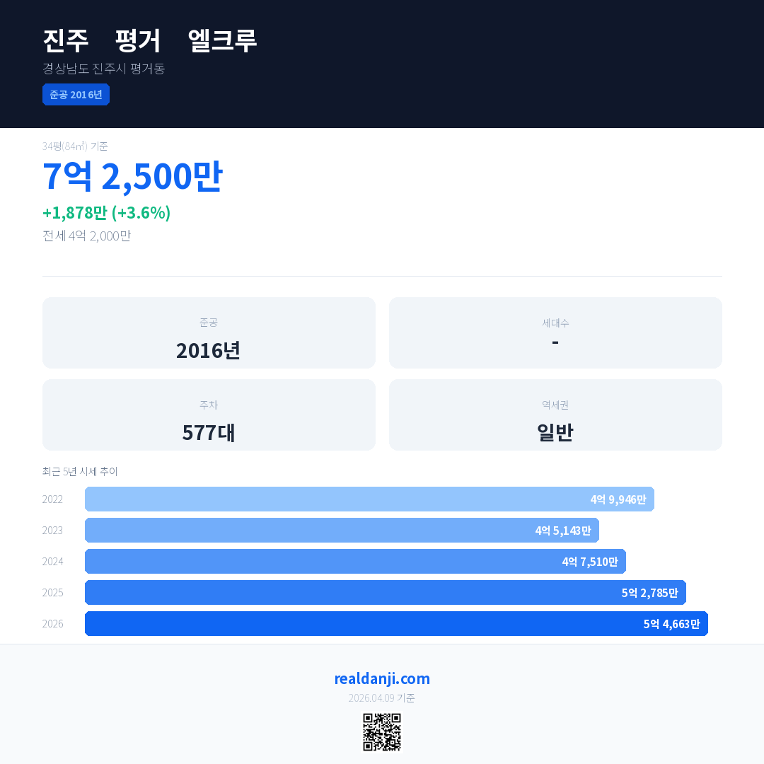 진주 평거 엘크루 국민평형 기준 2026년 평균 거래가는 5억 4,663만으로, 전년 대비 3.6% 상승 했습니다.