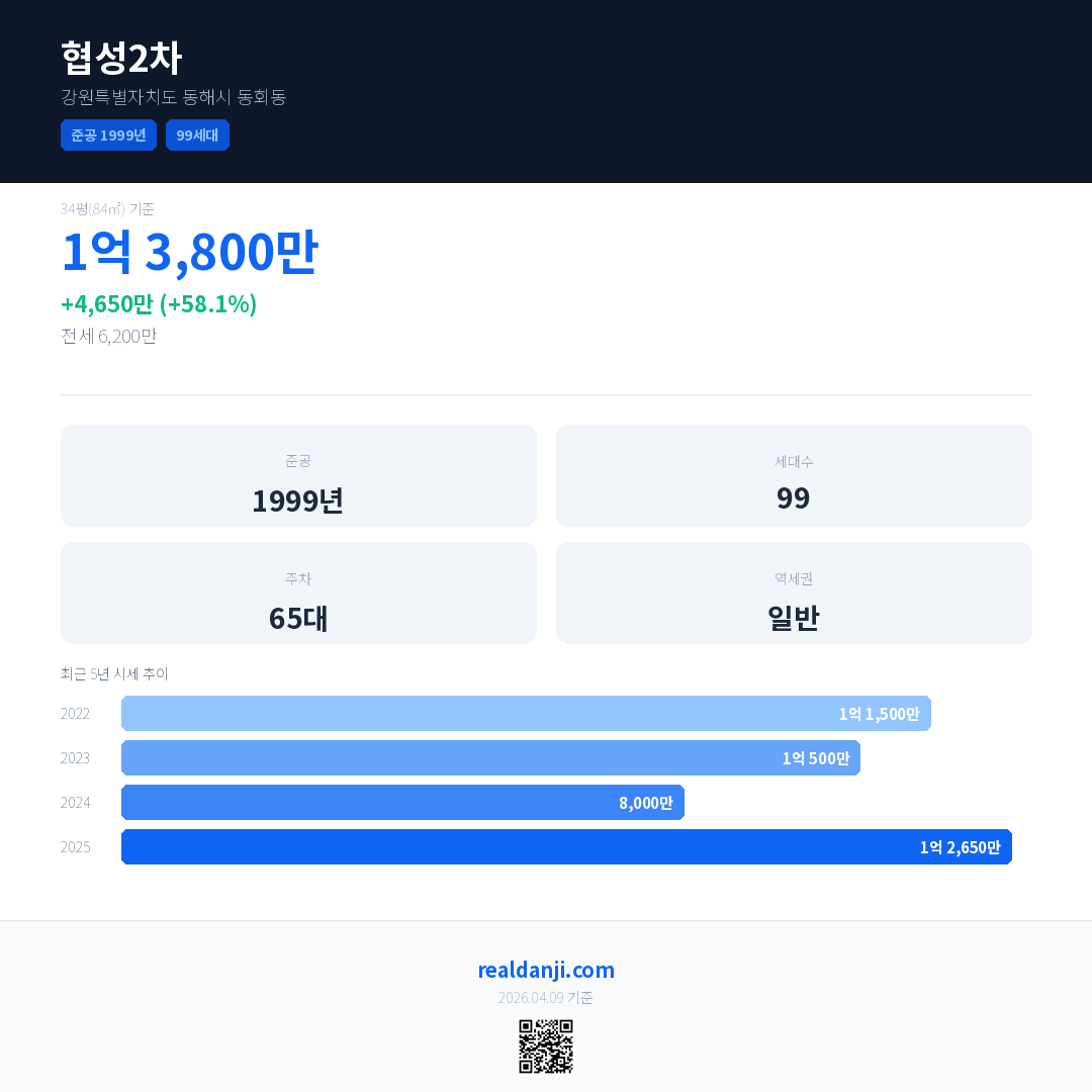협성2차 국민평형 기준 2025년 평균 거래가는 1억 2,650만으로, 전년 대비 58.1% 상승 했습니다.
