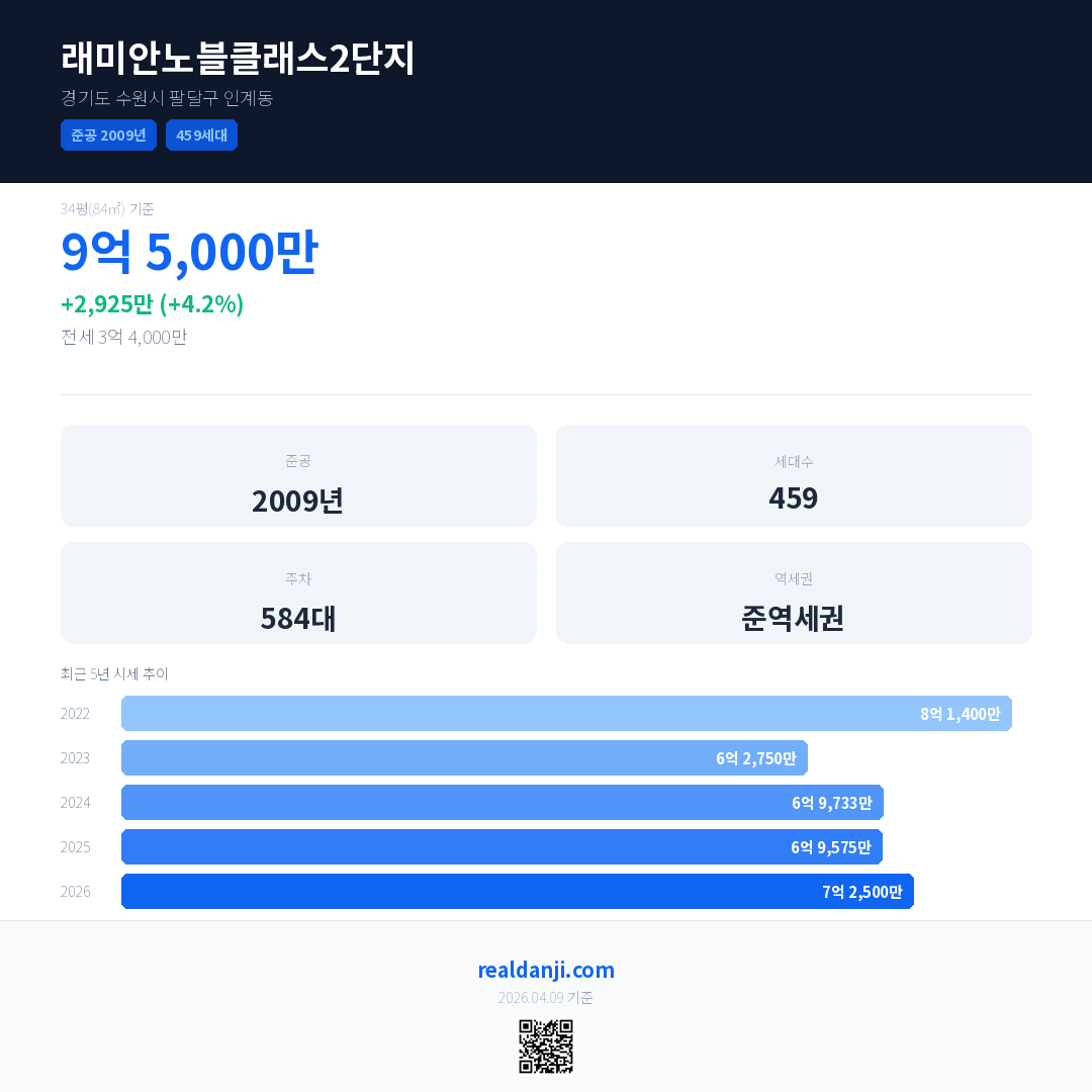 래미안노블클래스2단지 최근 거래가는 9억 5,000만입니다. (2026-02)