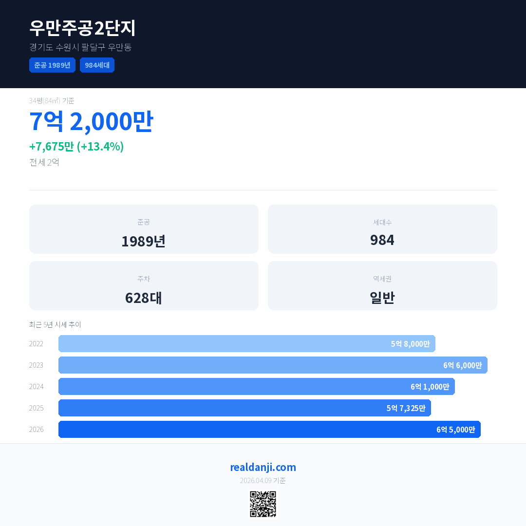 우만주공2단지 최근 거래가는 5억 5,000만입니다. (2026-04)