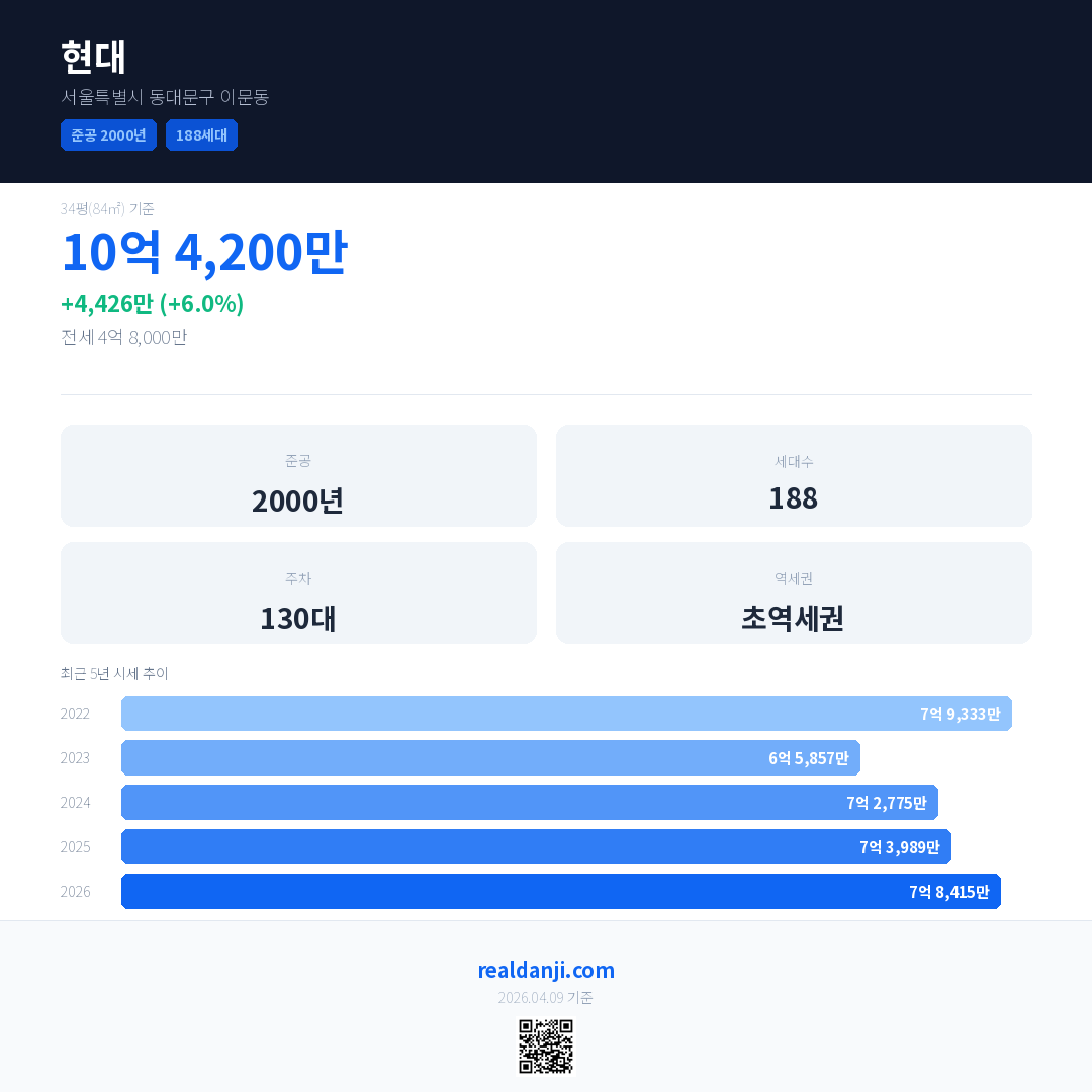 현대 국민평형 기준 2026년 평균 거래가는 7억 8,415만으로, 전년 대비 6.0% 상승 했습니다.