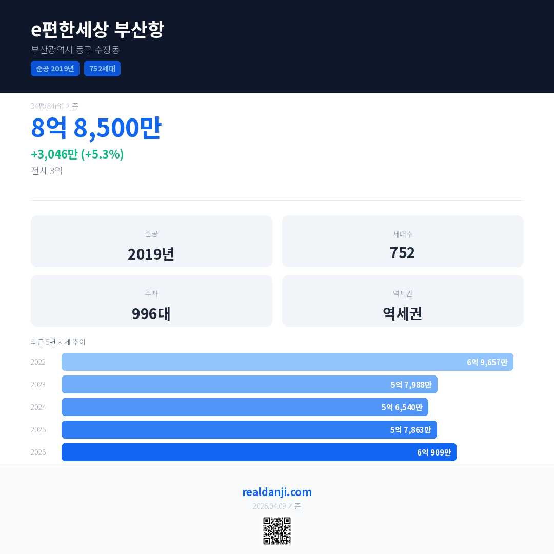 e편한세상 부산항 국민평형 기준 2026년 평균 거래가는 6억 909만으로, 전년 대비 5.3% 상승 했습니다.