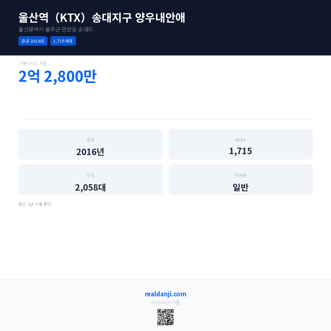 울산역(KTX)송대지구 양우내안애은(는) 2016년에 준공되었으며, 현재 10년차입니다. 총 1,715세대 규모입니다.