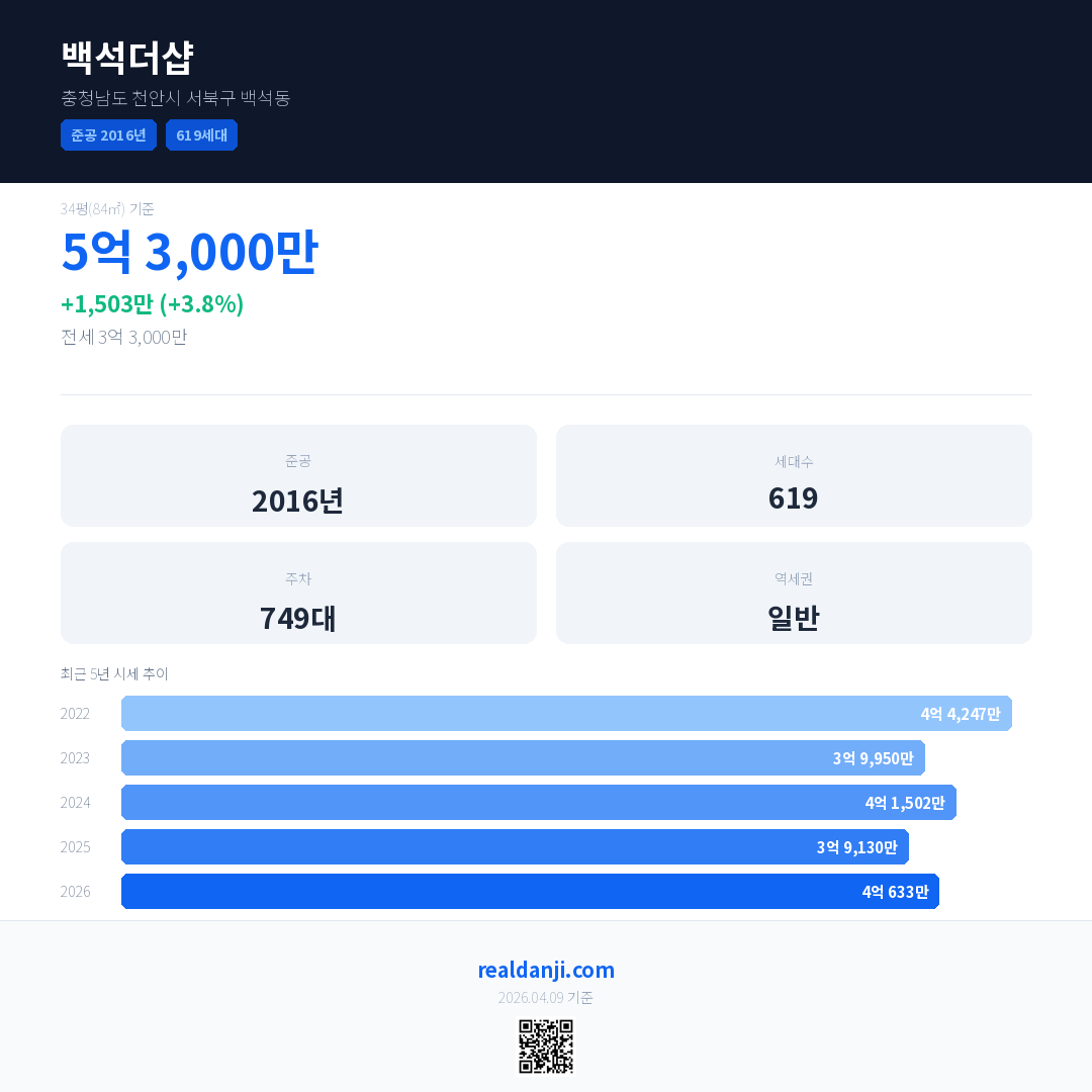 백석더샵 최근 거래가는 5억 3,000만입니다. (2026-04)