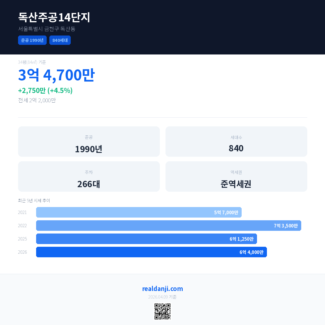 독산주공14단지 최근 거래가는 7억 3,500만입니다. (2026-03)