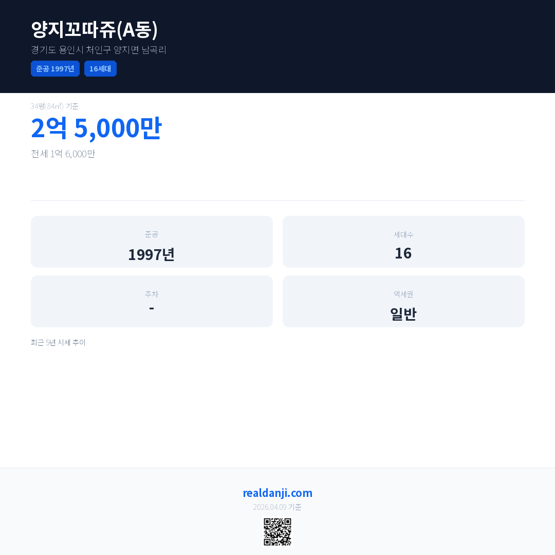 양지꼬따쥬(A동) 국민평형 기준 2016년 평균 거래가는 1억 5,700만으로, 전년 대비 4.7% 상승 했습니다.