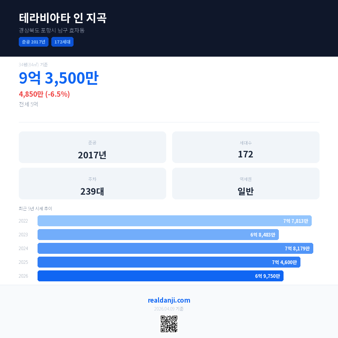 테라비아타 인 지곡 국민평형 기준 2026년 평균 거래가는 6억 9,750만으로, 전년 대비 6.5% 하락 했습니다.