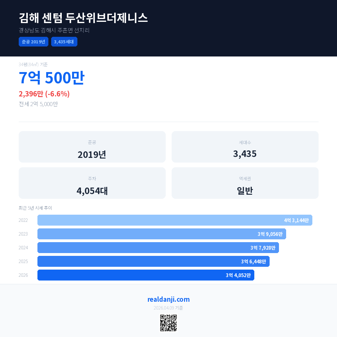 김해 센텀 두산위브더제니스 국민평형 기준 2026년 평균 거래가는 3억 4,052만으로, 전년 대비 6.6% 하락 했습니다.