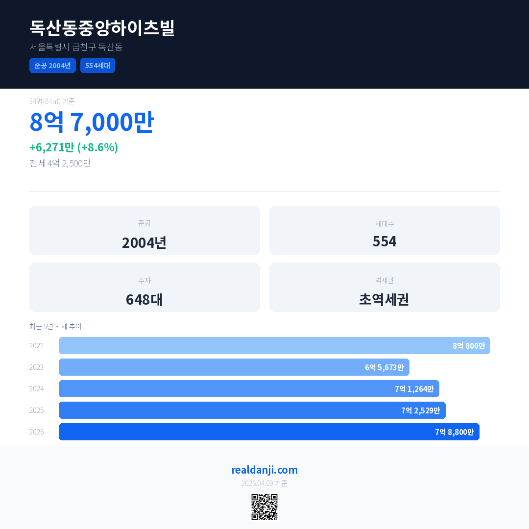 독산동중앙하이츠빌 최근 거래가는 8억 6,200만입니다. (2026-03)