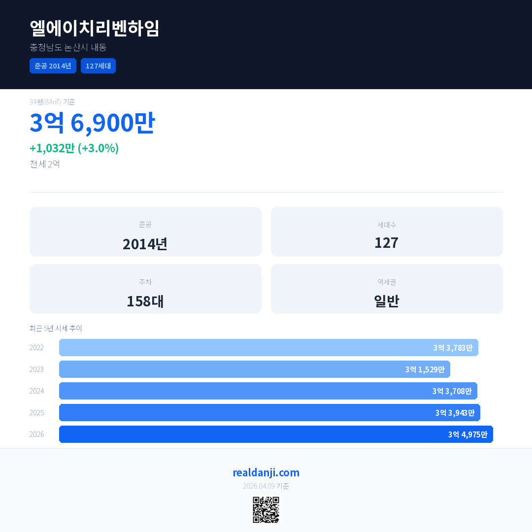 엘에이치리벤하임 국민평형 기준 2026년 평균 거래가는 3억 4,975만으로, 전년 대비 3.0% 상승 했습니다.