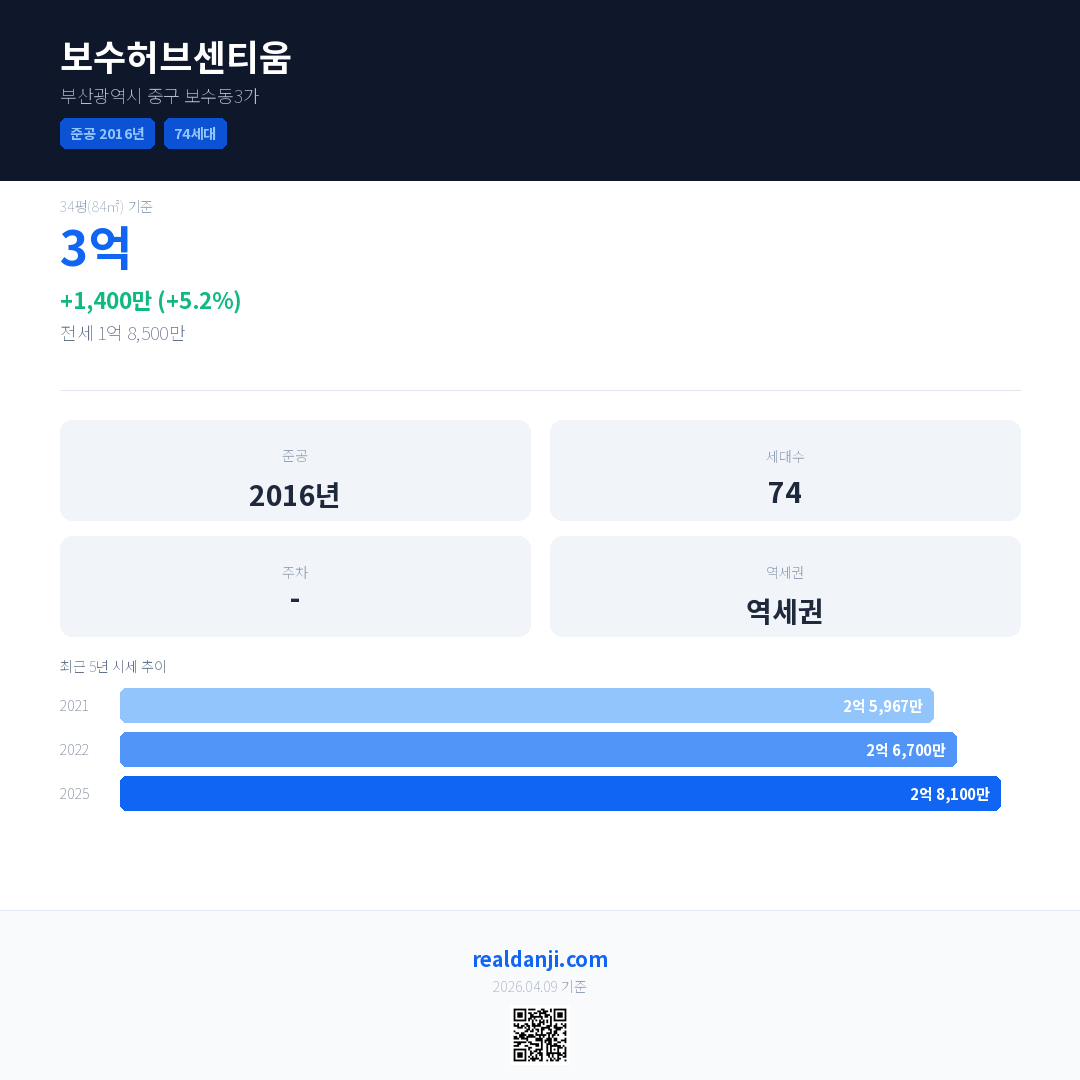 보수허브센티움 최근 거래가는 3억입니다. (2025-07)