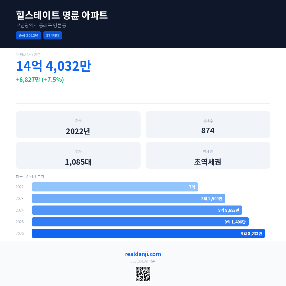 힐스테이트 명륜 아파트 국민평형 기준 2026년 평균 거래가는 9억 8,233만으로, 전년 대비 7.5% 상승 했습니다.