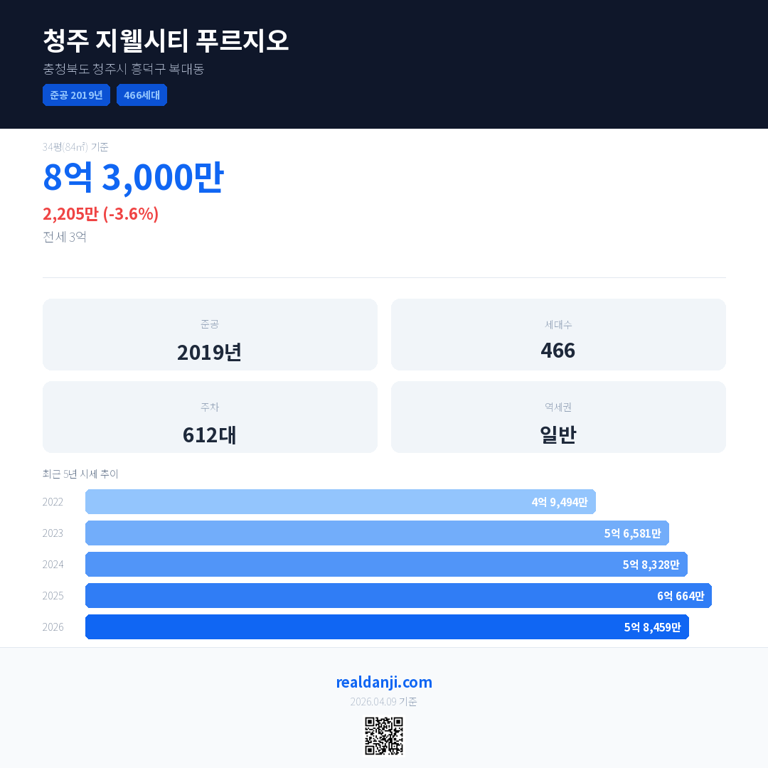 청주 지웰시티 푸르지오 국민평형 기준 2026년 평균 거래가는 5억 8,459만으로, 전년 대비 3.6% 하락 했습니다.