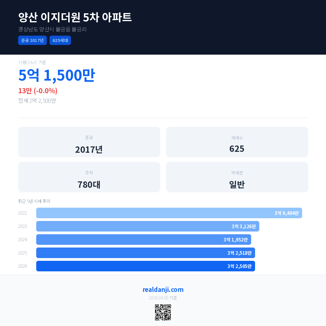 양산 이지더원 5차 아파트 최근 거래가는 5억 1,500만입니다. (2026-03)