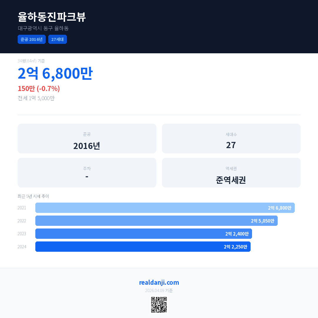 율하동진파크뷰 최근 거래가는 2억 6,800만입니다. (2024-06)