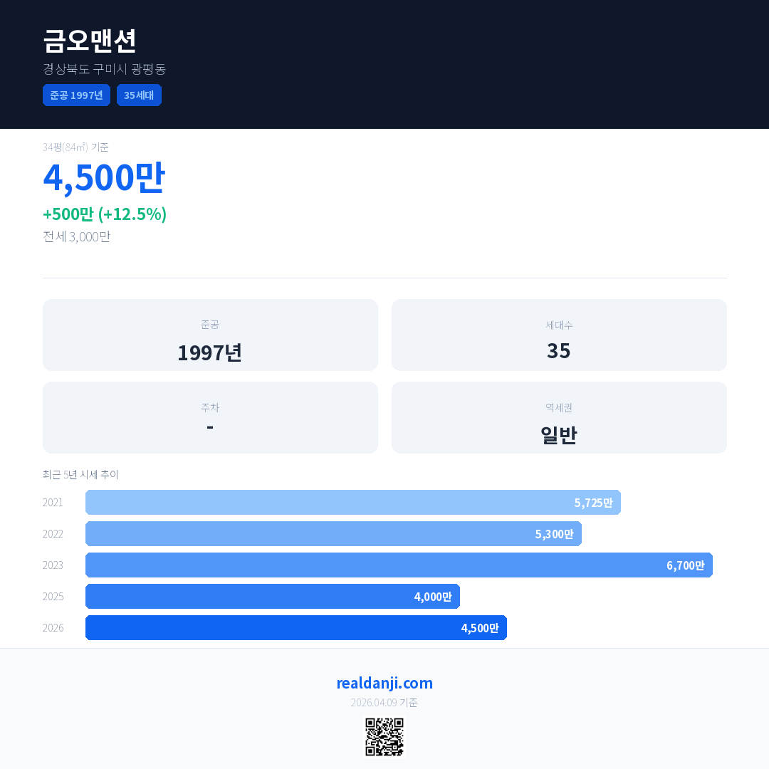 금오맨션 국민평형 기준 2026년 평균 거래가는 4,500만으로, 전년 대비 12.5% 상승 했습니다.