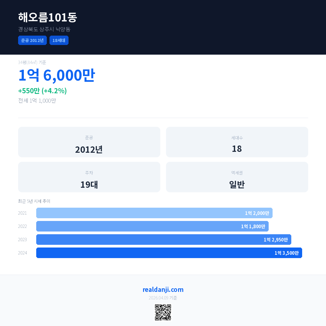 해오름101동 국민평형 기준 2024년 평균 거래가는 1억 3,500만으로, 전년 대비 4.2% 상승 했습니다.
