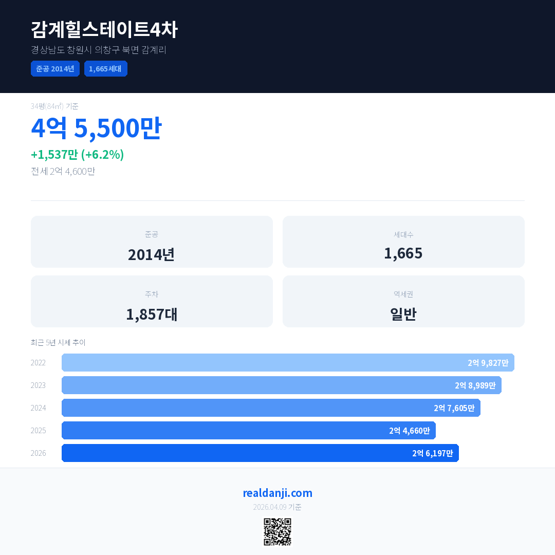 감계힐스테이트4차 국민평형 기준 2026년 평균 거래가는 2억 6,197만으로, 전년 대비 6.2% 상승 했습니다.