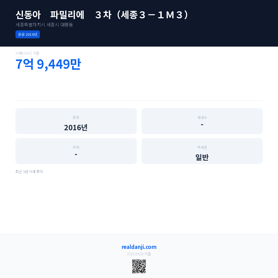 신동아 파밀리에 3차(세종3-1M3)은(는) 2016년에 준공되었으며, 현재 10년차입니다.