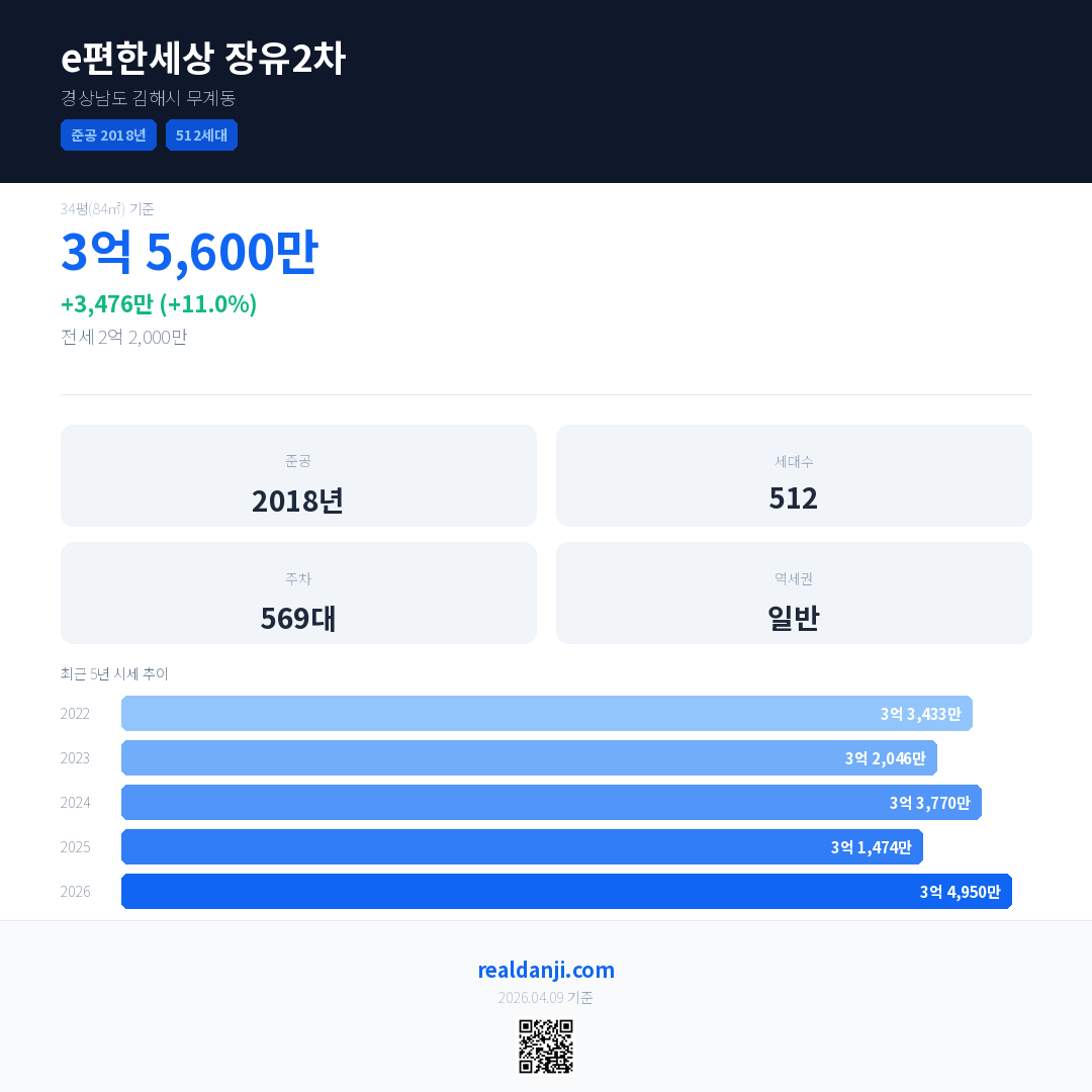e편한세상 장유2차 최근 거래가는 4억 3,500만입니다. (2026-02)