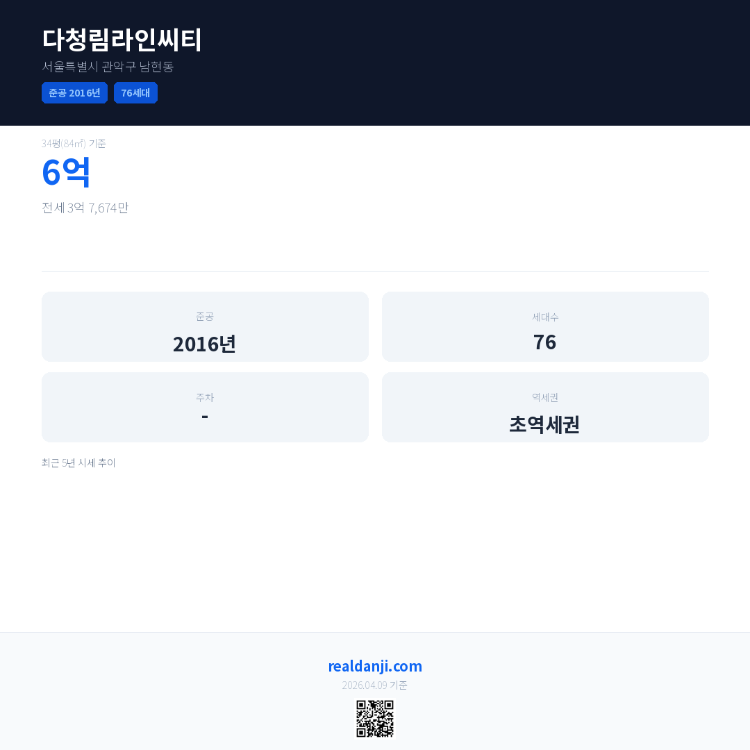 다청림라인씨티은(는) 2016년에 준공되었으며, 현재 10년차입니다. 총 76세대 규모입니다.