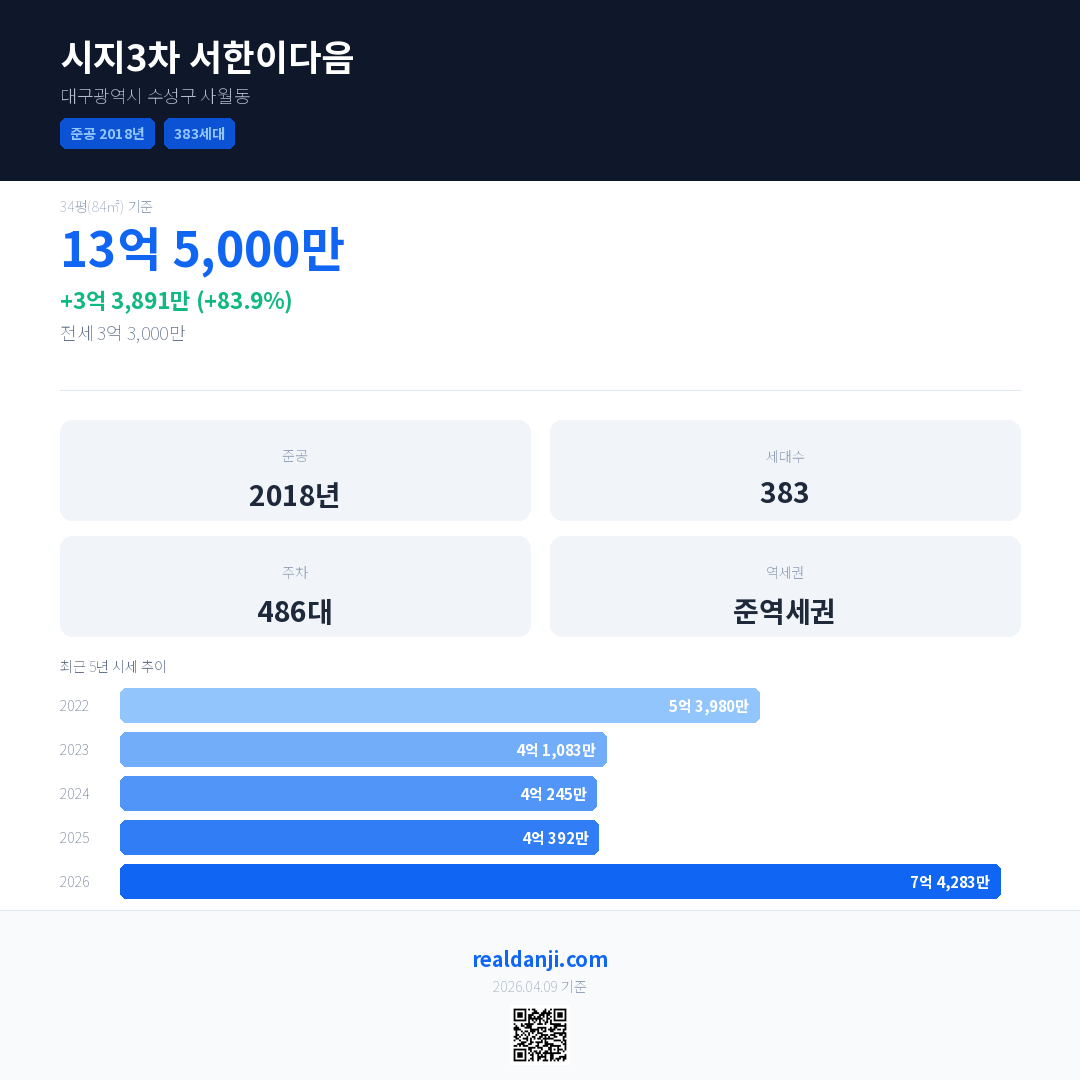 시지3차 서한이다음은(는) 2018년에 준공되었으며, 현재 8년차입니다. 총 383세대 규모입니다.
