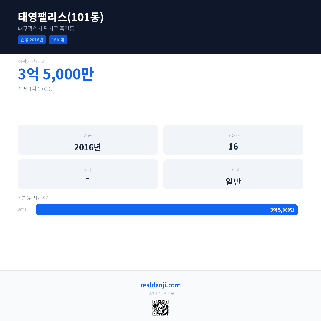 태영팰리스(101동)은(는) 2016년에 준공되었으며, 현재 10년차입니다. 총 16세대 규모입니다.