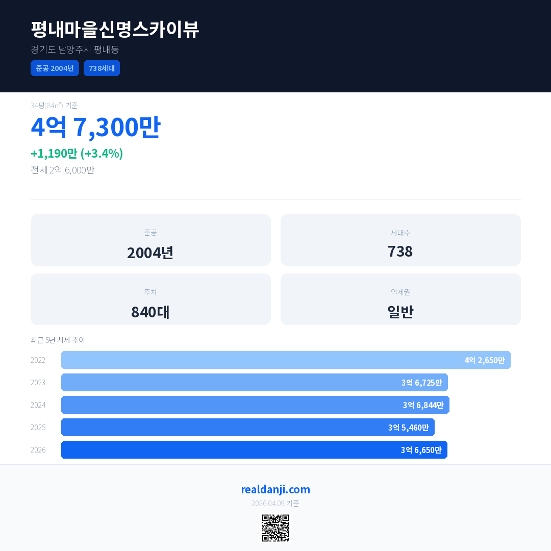 평내마을신명스카이뷰 국민평형 기준 2026년 평균 거래가는 3억 6,650만으로, 전년 대비 3.4% 상승 했습니다.