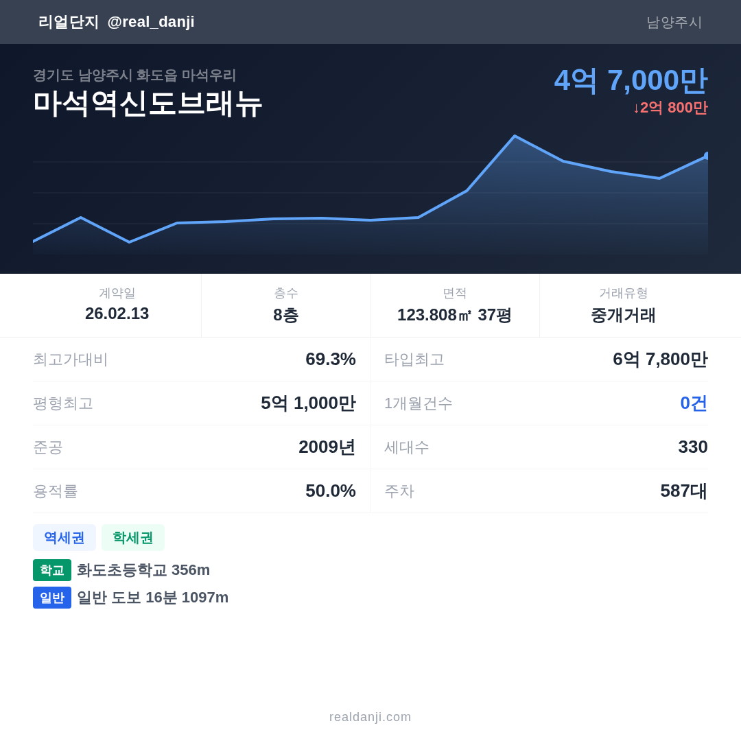 마석역신도브래뉴 최근 거래가는 6억 7,800만입니다. (2026-02)