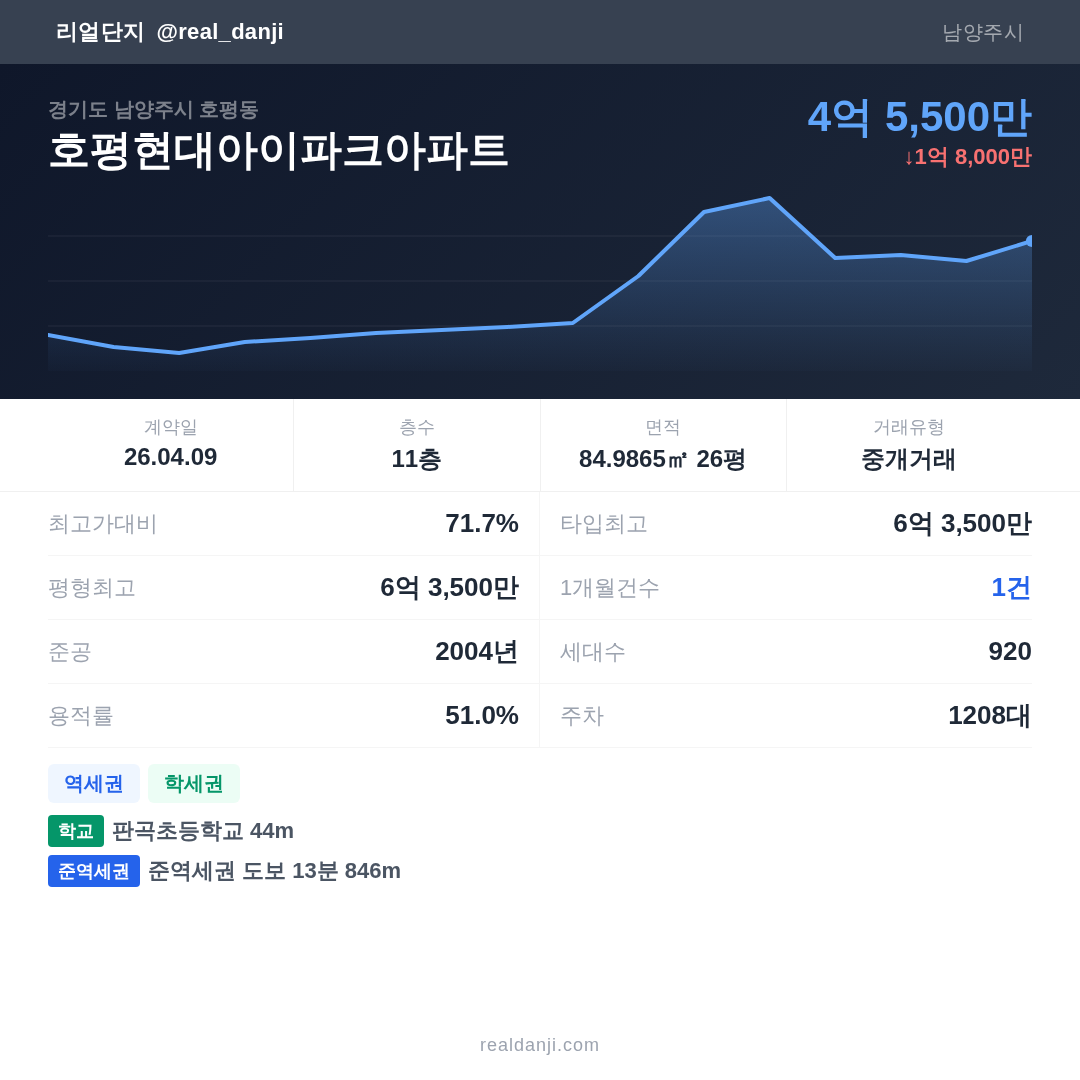 호평현대아이파크아파트 최근 거래가는 6억 3,500만입니다. (2026-04)