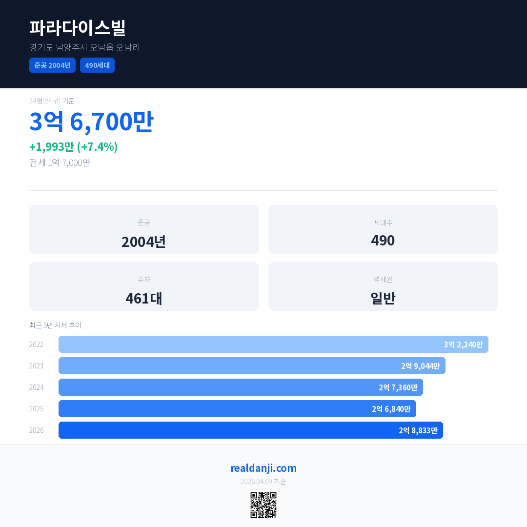 파라다이스빌은(는) 2004년에 준공되었으며, 현재 22년차입니다. 총 490세대 규모입니다.