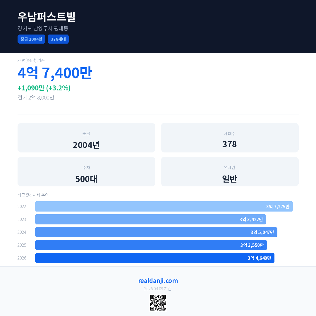 우남퍼스트빌 국민평형 기준 2026년 평균 거래가는 3억 4,640만으로, 전년 대비 3.2% 상승 했습니다.