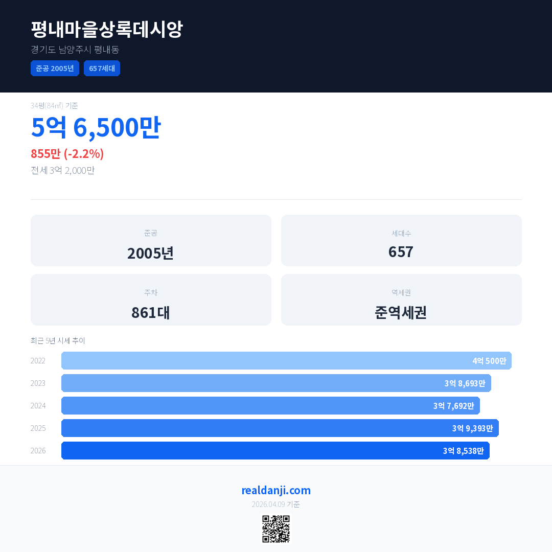 평내마을상록데시앙 최근 거래가는 5억 6,500만입니다. (2026-03)