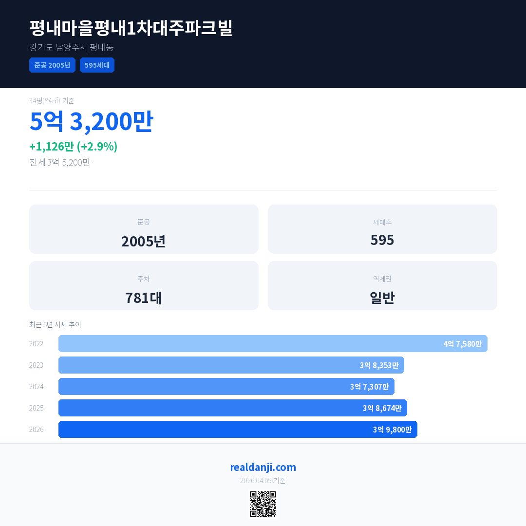 평내마을평내1차대주파크빌 최근 거래가는 5억 3,200만입니다. (2026-03)