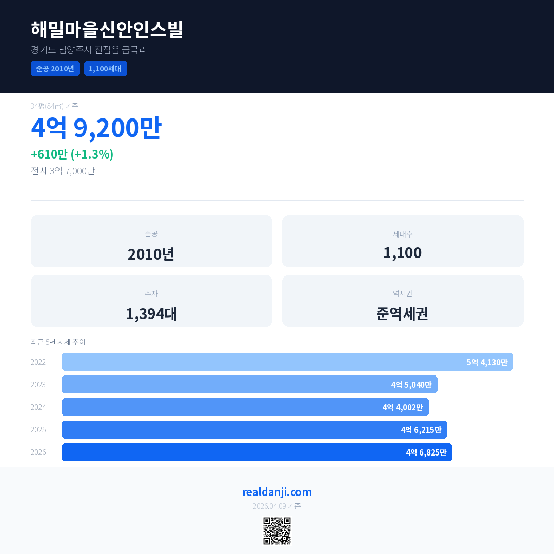 해밀마을신안인스빌 국민평형 기준 2026년 평균 거래가는 4억 6,825만으로, 전년 대비 1.3% 상승 했습니다.