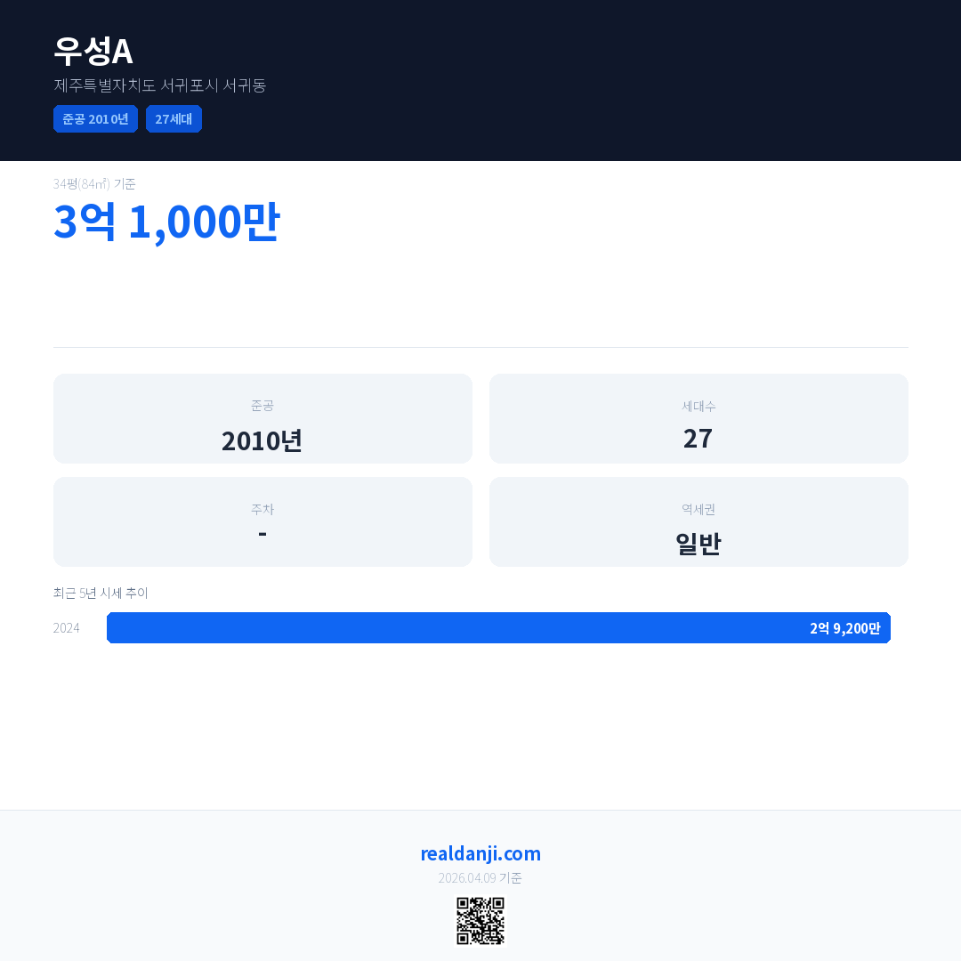 우성A은(는) 2010년에 준공되었으며, 현재 16년차입니다. 총 27세대 규모입니다.