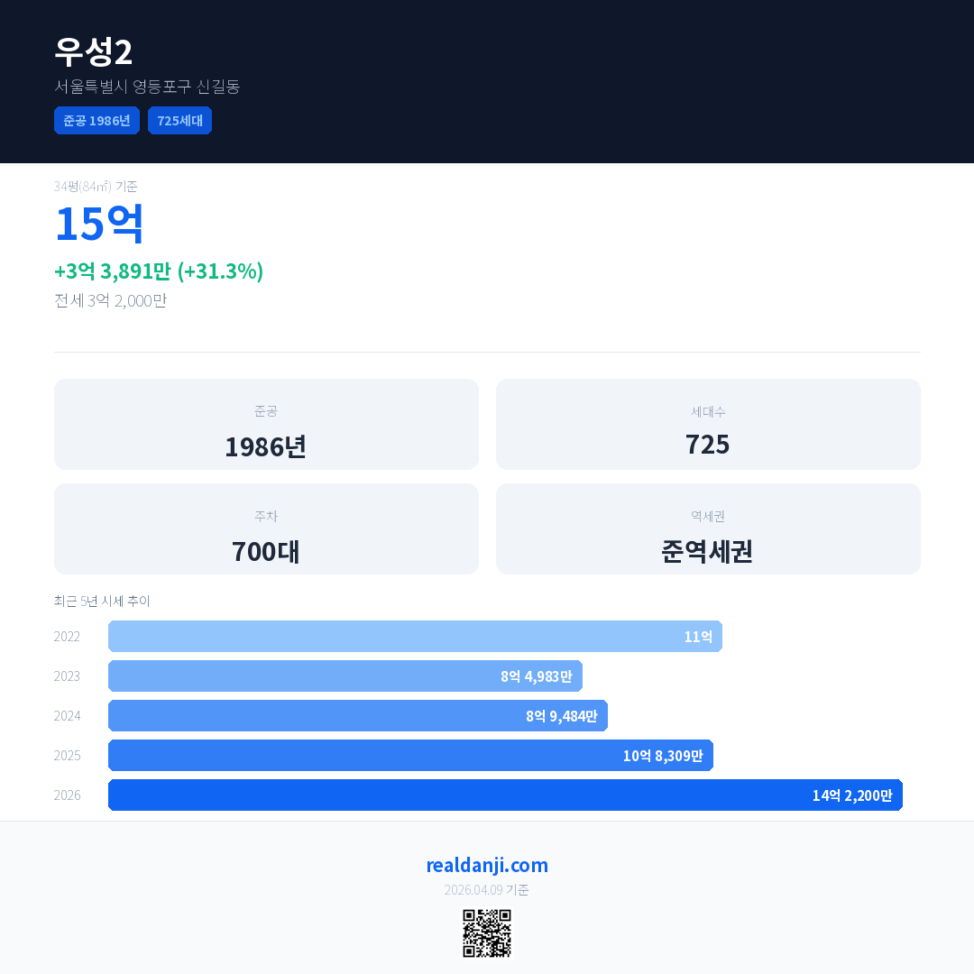 우성2 최근 거래가는 15억입니다. (2026-02)