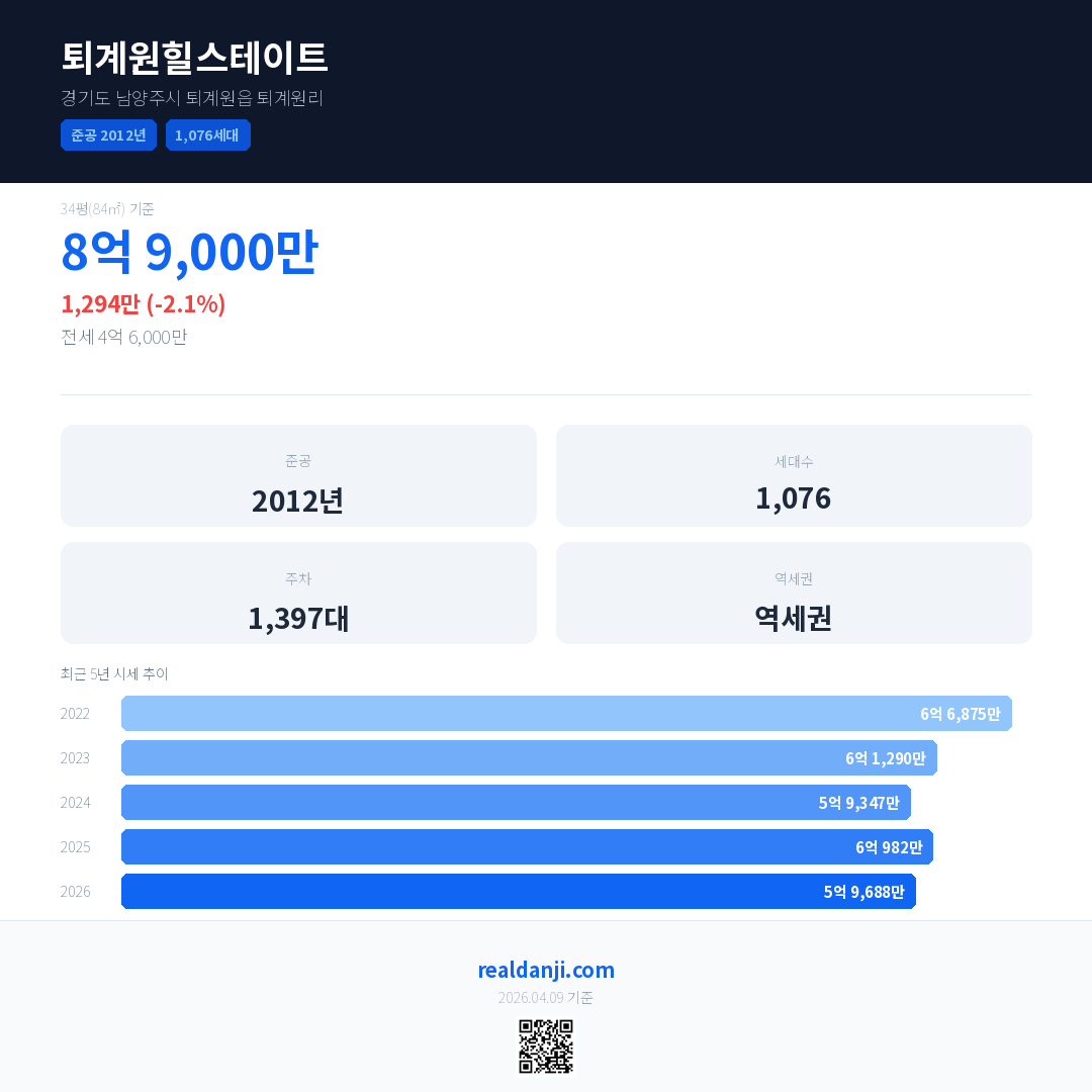 퇴계원힐스테이트 국민평형 기준 2026년 평균 거래가는 5억 9,688만으로, 전년 대비 2.1% 하락 했습니다.