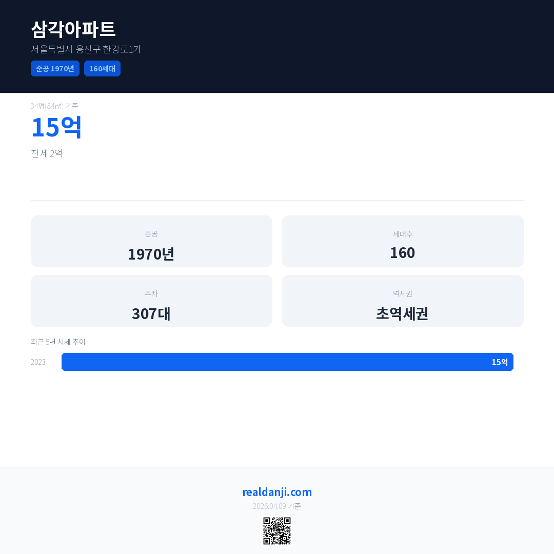 삼각아파트 최근 거래가는 15억입니다. (2026-02)